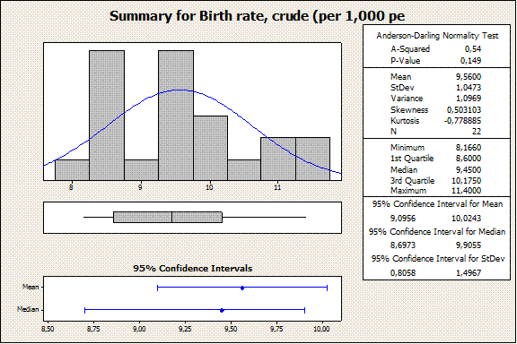 Variable Mean SE Mean StDev Sum Minimum Birth rate, crud 9,560 0,223 1,047 210,319 8,166 Variable Median Maximum Birth rate, crud 9,450 11,400 Mean или среднее арифметическое выборки – это сумма всех данных деленная на количество данных.