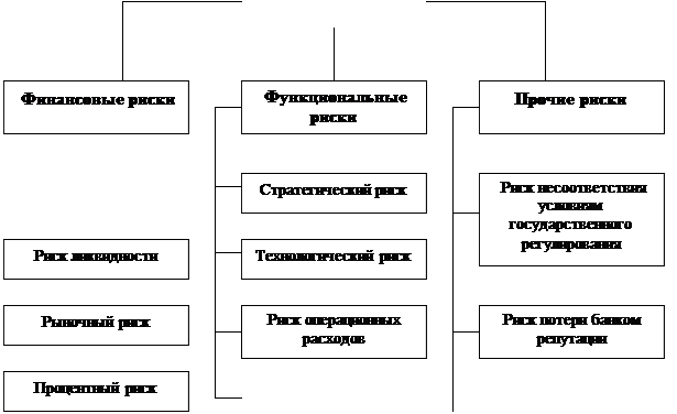 Функциональные риски имеют отношение к процессу создания любого продукта или оказания услуги и им подвержена деятельность каждого банка. Функциональные риски возникают вследствие невозможности своевременно и в полном объеме контролировать финансово-хозяйственную деятельность, собирать и анализировать соответствующую информацию. Они опасны не меньше, чем финансовые риски, но их труднее идентифицировать и определить количественно. В конечном итоге функциональные риски также приводят к финансовым потерям. Функциональные риски обусловлены субъективными и объективными причинами, а также системными сбоями. Функциональные риски включают в себя: 1. Стратегический риск Стратегический риск связан с ошибками в стратегическом управлении, прежде всего, с возможностью неправильного формулирования целей организации, неверного ресурсного обеспечения их реализации и неверного подхода к управлению риском в банковском деле в целом. Примером стратегической ошибки, подвергающей банк данному виду риска, является недоучет степени рискованности операций с производными финансовыми инструментами, когда развитие указанного направления деятельности не сопровождается вложениями в создание соответствующих систем управления риском. 2. Технологический риск Риск, связанный с использованием в деятельности банка различной техники и технологий, называется технологическим риском. При нем возможны потери из-за расходов на устранение неполадок в работе оборудования, а также из-за несанкционированного доступа к ключевой внутрибанковской информации. Данный риск присутствует у любого предприятия, но управление им для банка приобретает первостепенную важность. Типичные примеры случаев проявления технологического риска – компьютерное мошенничество и сбои в системе электронных платежей. 3.Риск операционных или накладных расходов (риск неэффективности) Риск неэффективности связан с опасностью несоответствия между расходами банка на осуществление своих операций и их результативностью. К коэффициентам операционного риска можно отнести: суммарные активы/число сотрудников; прибыль/число служащих; неоперационные расходы/суммарные активы; расходы на содержание помещений, оборудования/операционные расходы; заработная плата/число сотрудников и другие. 4. Риск внедрения новых продуктов и технологий (внедренческий риск) Внедренческий риск - это риск того, что не будет достигнута запланированная окупаемость новых банковских продуктов, услуг, операций, подразделений и технологий.