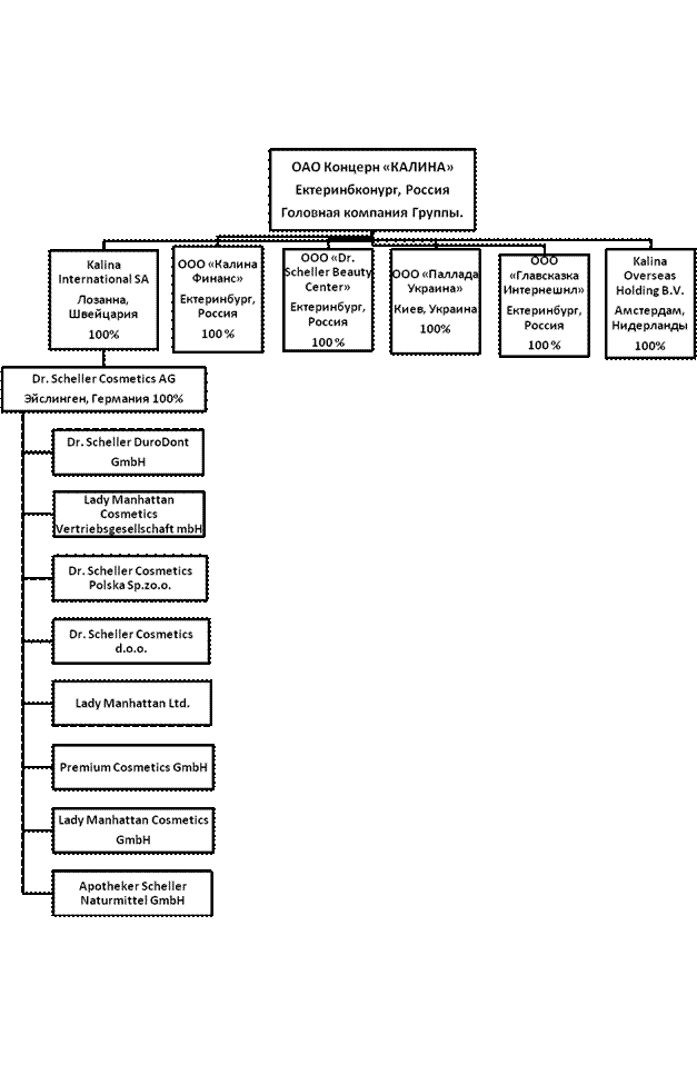 2.1. Организационно-экономическая характеристика предприятия ОАО Концерн «Калина» является парфюмерно-косметической компанией, выпускающей и предлагающей своим потребителям в России, странах Европы и СНГ большое разнообразие парфюмерно-косметической продукции и продукции бытовой химии. Концерн «Калина» развивает сильные бренды во всех ключевых сегментах российского парфюмерно-косметического рынка. Благодаря таким брендам, как «Черный жемчуг», «Чистая линия», «Бархатные ручки», «100 рецептов красоты», «32», «Лесной бальзам», «Manhattan», «Dr.Scheller», «Manhattan Clearface», Концерн «Калина» является лидером в сегменте средств по уходу за кожей и одним из лидеров в сегменте средств по уходу за полостью рта на российском рынке и рынках стран СНГ, а также находится среди лидеров в сегментах декоративной косметики и средств по уходу за кожей на рынке Германии. Компания также активно работает в сегментах средств по уходу за волосами, косметики и парфюмерии для мужчин. Компания была основана в 1942 году на базе эвакуированной из Москвы фабрики «Новая Заря». В 1970 году фабрика подверглась коренной реконструкции и модернизации оборудования и получила название «Уральские Самоцветы». В 1974 году была выпущена первая партия продукции в парфюмерном цехе знаменитый «Тройной» одеколон. Новая технологическая линия по выпуску косметических средств по уходу за кожей в тубах была установлена в 1975 году. Концерн запустил новую линию по производству продукции по уходу за полостью рта, по производству мыла и упаковочную линию в 1990-ых годах. Концерн - первое в России предприятие в своей отрасли, прошедшее сертификацию по системе ISO 9000 (стандарты качества), его продукция признана зарубежными экспертами как соответствующая самым жестким европейским требованиям. После приватизации в 1992 году Тимур Горяев консолидировал контрольный пакет акций предприятия, а в 2000 г. ЕБРР приобрёл новый выпуск акций и стал владельцем 19,24% пакета акций вместе с двумя; венчурными фондами. В 1999 году ОАО «Уральские самоцветы» было переименовано в ОАО «Концерн «Калина». В апреле 2004 года компания разместила дополнительный выпуск акций в рамках первичного публичного размещения на ММВБ, увеличив free-float по своим акциям примерно до 33%. В 2005 году «Калина» сделала дальнейшие важные шаги на пути своего развития, а именно был приобретен контрольный пакет акций немецкого производителя косметики Dr.Scheller Cosmetics AG. Также в течение 2005 года была осуществлена техническая модернизация производства компании с целью создать запас производственной мощности для соответствия программе развития Концерна, повысить автоматизацию и качество производства. В 2007 был запущен проект сети красоты Dr. Scheller Beauty Center, а также проект «Главсказка Интернешнл» для выхода на рынок детских товаров. В 2010 консолидировано 100% акций Dr.Scheller Cosmetics AG . Миссия Компании: Создание лидирующих брендов на рынке косметики и парфюмерии Ценности Компании: - · Лидерство - · Честность - · Результативность Основные компоненты стратегии Компании: 1. Успешный маркетинг - Маркетинг, ориентированный на потребителя - Концентрация на успешных продуктах - Рост в ключевых продуктовых и географических сегментах рынка 2. Лидерство в дистрибуции - Бренды Компании представлены в 100% розничных точек, соответствующих критериям Компании - Долговременные взаимовы