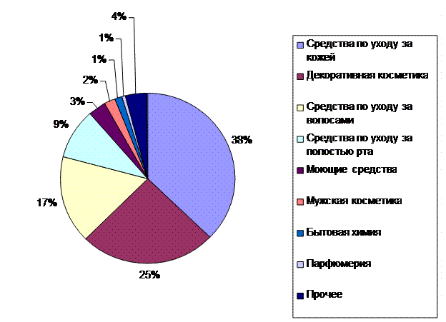 Наглядно доли продаж удобно рассмотреть на приведенной ниже диаграмме. Видно, что лидирующее место занимают средства по уходу за кожей – 38%, затем идет декоративная косметика – 25%, чуть уступают средства по уходу за волосами, 9% - занимают средства по уходу за полостью рта, моющие средства и бытовая химия – 3% и 1% соответственно. Мужской косметики выпускают только 2 % от общего количества продукции.