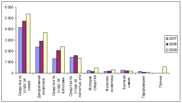 Рис.2 Разбивка продаж по категориям продукции за 2009г Если же рассматривать срез продаж выпускаемой продукции Концерна «Калина» за последние 3 года, то налицо увеличение средств по уходу за кожей и волосами, декоративной косметики, моющих средств, мужской косметики. Но на ряду с этим отмечается спад продаж по некоторым категориям: средств по уходу за полостью рта, бытовой химии, парфюмерии. В 2009 году значительно возросли продажи категории в прочих.