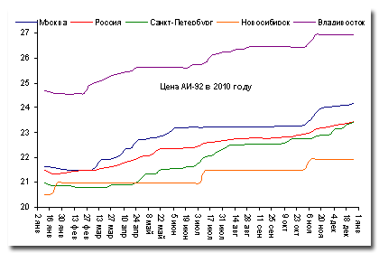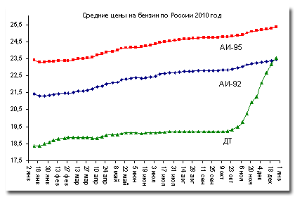 | Средние потребительские цены на бензин автомобильный и дизельное топливо по России, Москве и Санкт-Петербурге в 2010 году |