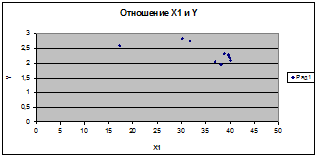 Полученная диаграмма свидетельствует о слабой обратной зависимости. Введем гипотезу, что между фактором Х и показателем У нет корреляционной зависимости. 1.3 Оценка тесноты связи между результативным показателем У и фактором Х на основании коэффициента парной корреляции Парные коэффициенты корреляции вычисляем по формуле: