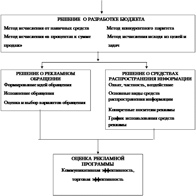 Из этой модели следует, что процесс покупки начинается задолго до совершения акта купли-продажи, а ее последствия проявляются в течение долгого времени после совершения этого акта. Модель нацеливает деятеля рынка на внимание к процессу в целом, а не только к этапу принятия решения. Судя по модели, потребитель преодолевает все пять этапов при любой покупке. Однако при совершении обыденных покупок он пропускает некоторые этапы или меняет их последовательность. Так, женщина, приобретающая привычную для себя марку зубной пасты, после осознания проблемы сразу принимает решения о покупке, пропуская этапы сбора информации и оценки вариантов. Однако, мы будем оперировать полной моделью, представленной на рис.3 , поскольку в ней отражены все соображения, возникающие когда потребитель сталкивается с новой для себя ситуацией, особенно если при этом предстоит решить немало проблем. Глава III . Продвижение товара 3.1 Продвижение товара Современный маркетинг требует гораздо большего, чем просто создать хороший товар, назначить на него привлекательную цену и обеспечить его доступность для целевых потребителей. Фирмы должны еще осуществлять коммуникацию со своими заказчиками. При этом в содержании коммуникаций не должно быть абсолютно ничего случайного. Чтобы обеспечить действенную коммуникацию, фирмы нанимают рекламные агентства для создания эффективных объявлений, специалистов по стимулированию сбыта для разработки поощрительных программ и специалистов по организации общественного мнения для формирования образа организации. Фирмы учат свой торговый персонал быть приветливым и осведомленным. Для большинства фирм вопрос не в том, заниматься коммуникацией или нет, а в том, сколько и как именно тратить в этой сфере. Современная фирма управляет сложной системой маркетинговых коммуникаций. Сама она поддерживает коммуникации со своими посредниками, потребителями и различными контактными аудиториями. Потребители занимаются устной коммуникацией в виде молвы и слухов друг с другом и другими контактными аудиториями. И одновременно каждая группа поддерживает коммуникационную обратную связь со всеми остальными. Комплекс маркетинговых коммуникаций (называемый также комплексом стимулирования) состоит из четырех основных средств воздействия: Реклама – любая платная форма неличного представления и продвижения идей, товаров и услуг от имени известного спонсора. Организации подходят к проведению рекламы по-разному. В мелких фирмах рекламой обычно занимается один из работников отдела сбыта, время от времени вступающий в контакт с рекламным агентством. Крупные фирмы учреждают у себя отделы рекламы. Управляющий таким отделом подчиняется вице-президенту по маркетингу. В процессе разработки программы рекламной деятельности руководству службой маркетинга необходимо принять пять принципиально важных решений. Они перечислены в схеме на рис.4 Рис.4 Основные решения в рекламе