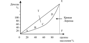 Если имеет место равенство доходов, то оно отражается прямой линией ОЕ. Если имеет место неравенство в доходах, то линия ABCDE отражает фактическое распределение доходов и называется кривой Лоренца . G=S(T)/SΔOEF G — показатель, измеряющий степень неравенства в доходах — коэффициент Джинни . Чем больше отклонение кривой Лоренца от биссектрисы ОЕ, тем будет больше площадь фигуры Т и тем больше будет коэффициент G. В реальности фактическое распределение дохода показано линией ОАВСОЕ. Величина G может колебаться теоретически от 0 до 1, но на практике не достигает этих крайних значений. Очевидно, чем больше отклонение кривой Лоренца от биссектрисы, тем больше площадь фигуры Т, и, следовательно, тем больше коэффициент Джини будет приближаться к 1. Неравенство в распределении доходов существует как в странах рыночной экономики, так и в нашей стране. Разрешение такой острой социальной проблемы как бедность есть одно из направлений деятельности государства и связано с поддержкой на уровне хотя бы прожиточного минимума, а также сокращением (экономическими средствами) числа лиц, живущих за чертой бедности. Необходимо также отметить, что различия в уровне потребления могут зависеть и от факторов, не относящихся к внутренним свойствам труда и его качества у самого работника. Прежде всего к таким факторам относятся: размер семьи, соотношение количества работающих и иждивенцев в семье, состояние здоровья, географические и климатические условия и т. д. Мероприятия государства по смягчению резкой дифференциации в доходах населения: 1. Государство осуществляет трансфертные выплаты, распределяет продукты и услуги, а также проводятся государственные программы по стабилизации доходов. 2. Через каналы государственных программ помощи удовлетворяются потребности в воспитании новых членов общества, содержании престарелых и нетрудоспособных, обеспечении (отчасти) получения образования, сохранения здоровья. Чрезмерно активное вмешательство государства в пере распределительные процессы, выравнивание доходов ведет к снижению деловой активности в обществе и сокращению эффективности производства в целом. С другой стороны, сокращение роли государства в регулировании доходов населения ведет к росту дифференциации доходов, социальной напряженности, обострению социальных конфликтов и в итоге к падению производства, снижению его эффективности. Показатели, отражающие дифференциацию доходов населения, важны для анализа реальных социально-экономических процессов, их мониторинга при проведении активной социальной политики, используются также при составлении государственных программ социально-экономического развития. Использованная литература: 1. Общая теория статистики. Коллектив авторов под ред. Спирина А. А, Башиной О. Э. – М.: «Финансы и статистика», 1999 2. Т.В. Чернова. Экономическая статистика. Учебное пособие. Таганрог: Изд-во ТРТУ, 1999 3. Васнев С.А.Статистика: Учебное пособие. Москва: МГУП, 2001. 4. http://www.vuzlib.net/beta3/html/1/4799/4833/ |