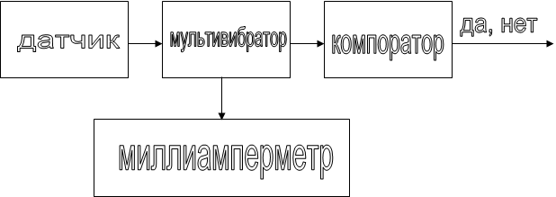 Рис. 2 3.3. Устройство для принятия решения о нормальной частоте вращения коленчатого вала. Для измерения частоты коленчатого вала и представления ее в цифровом или аналоговом виде необходимо частотный сигнал, поступающий с датчика преобразовать с помощью ждущего мультивибратора в ток, сила которого будет пропорциональна частоте вращения коленчатого вала. Полученное значение силы тока, измеренное с помощью миллиамперметра будет указывать частоту вращения коленчатого вала. Для того чтобы исключить вращение коленчатого вала с чатотой ниже или выше допустимых значений необходимо применить схему компаратора описанного выше, котрый будет выдавать сигнал логической еденицы в случае выхода частоты вращения за допустимые пределы. Схема контроля в этом случае будет выглядеть так:
