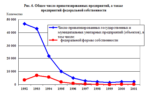 Всего в 1992 – 2002 гг. изменили форму собственности 140,3 тыс. государственных и муниципальных унитарных предприятий, объектов. По оценкам экспертов, начальные этапы приватизации создали определенные предпосылки для решения задач преодоления кризисных явлений в экономике и дальнейшего развития. Приватизационные процессы, развивавшиеся в течение десяти лет, привели к существенному изменению структуры собственности в Российской Федерации в целом.