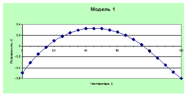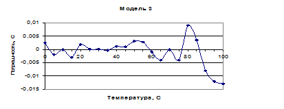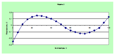 Для сравнения моделей 1, 2 и 3 были использованы таблицы [6], представляющие собой градуировочные характеристики термисторов из различных материалов, выпускаемых фирмой BetaTHERM. Ниже приводятся результаты анализа для термисторов из материала № 7 (из этого материала изготовлены миниатюрные microchip, используемые в приборах НТЦ «ГеоПАЛС»). В диапазоне температур (0...100) ºС были методом наименьших квадратов определены постоянные коэффициенты для каждой из моделей 1, 2, 3, определены погрешности аппроксимации во всех точках диапазона температур (через 5 ºС) и максимальная погрешность аппроксимации. Зависимости погрешности от температуры для моделей 1, 2, 3 представлены на рис. 4.1. Анализ этих графиков показывает, что модель 1 и модель 2 имеют существенные систематические погрешности. В то же время отклонения данных от модели 3 имеют случайный характер, а следовательно дальнейшее усложнение модели нецелесообразно. Максимальная погрешность для модели 1 составляет 0,6 ºС, для модели 2 – 0,25 ºС, для модели 3 – 0,012 ºС, причем погрешность для модели 3 имеет случайный характер и определяется главным образом погрешностью получения исходных экспериментальных данных. Таким образом, наилучшей математической моделью термистора является модель 3. Аналогичные выводы получены при анализе характеристик термисторов фирмы BetaTHERM, изготавливаемых из других материалов. Графики зависимости погрешности от температуры для моделей 1, 2, 3