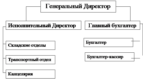 Как видно из табл.1, в 2009 году наблюдается улучшение всех экономических показателей работы предприятия по сравнению с их состоянием на 2008 год. Так, рентабельность коммерческой деятельности увеличилась на 2,25 %, составив 25,2 % в 2009 году. На увеличение рентабельности коммерческой деятельности, прежде всего, повлияли увеличение прибыли от реализации консервов и снижение затрат на 1 руб. реализованной продукции. 2.1.3 Организационная структура управления ООО «Исток-Идеал» Так как предприятие ООО «Исток-идеал» занимается оптово-посреднической деятельностью, то его организационная структура значительно упрощена. На предприятии отсутствуют производственные цеха. Генеральному директору подчинены Исполнительный директор и Главный бухгалтер. В свою очередь Исполнительному директору подотчетны складские отделы, транспортный отдел, подсобное хозяйство и канцелярия. В подчинении у Главного бухгалтера на предприятии работают бухгалтер и бухгалтер-кассир. Складские отделы занимаются складированием, хранением, отпуском рыбных, мясных и овощных консервов, а также проводят инвентаризацию склада. Транспортный отдел осуществляет транспортное обеспечение деятельности предприятия. В связи с тем, что на предприятии ООО «Исток-идеал» достаточно большой поток деловых документов, организацию делопроизводства и работу с документами обеспечивает специальное подразделение – канцелярия.