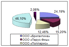 Как видно из приведенных в табл. 3 данных, в 2009 г. по сравнению с 2008 г. количество предприятий, с которыми сотрудничает ООО «Исток-идеал», осталось без изменений, а вот в структуре сбыта произошли достаточно серьезные изменения. Наглядно эти изменения показаны на рис.8 и 9.: Рис. 8. Структура реализации продукции за 2008 г. Рис.9. Структура реализации продукции за 2009 г. Как видно из графиков, в 2009 г. произошло увеличение доли ООО «Финпром» (с 39,3% до 46,1%) и ООО «Бригантина» (с 18,4% до 24,2%). Таким образом, в 2009 г. два этих предприятия покупали у ООО «Исток-идеал» 70,3% его продукции. Снизился удельный вес закупок ООО «Парус-Фиш» (с 24,8% до 15,2%), а доля ООО «Макрус» стала совсем незначительной, снизившись с 5,1% до 2,1%. Доля ООО «Полларис» практически не изменилась (12,4% – 12,5%) Таким образом, в результате изменения структуры сбыта продукции сложилась ситуация, когда значительную долю своей продукции (70,3%) предприятие реализует лишь двум организациям, а остальная ее часть приходится на долю 3-х предприятий, причем ООО «Макрус» уже практически не влияет на структуру сбыта, т.к. покупает у предприятия всего 2,1% его продукции, и, по всей видимости, в 2010 г. не будет осуществлять оптовых закупок у ООО «Исток-идеал». 2.3 Анализ системы распределения продукции предприятия Как уже описывалось выше, используемая предприятием система сбыта имеет всего один распределительный центр – склад готовой продукции. Схематически данная система уже была изображена на рис. 7. Более подробное изображение, учитывающее реальное количество посредников и их место нахождения на территории г. Брянска, дано на рис. 10: