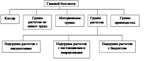 Рис. 8 Схема линейной организации бухгалтерского аппарата При линейно-функциональной схеме учет организуется в разрезе структурных производственных и управленческих подразделений (по линейному принципу), а внутри бухгалтерских служб выделяются функциональные подслужбы по участкам учетной работы или по функциям в процессе обработки и составления отчетности, как показано на рис.9.