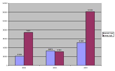 Значительное улучшение финансовых и операционных результатов «Вымпелкома» в 2004 году по сравнению предыдущими годами годом было достигнуто преимущественно благодаря значительному росту абонентской базы наряду с эффектом экономии на масштабах, эффективному управлению расходами и уменьшению затрат на привлечение одного абонента в регионах за пределами Москвы. На рис. 3–5 представлены данные по составляющим активов Ростовского филиала ОАО «Вымпелком» в 2002–2004 гг.