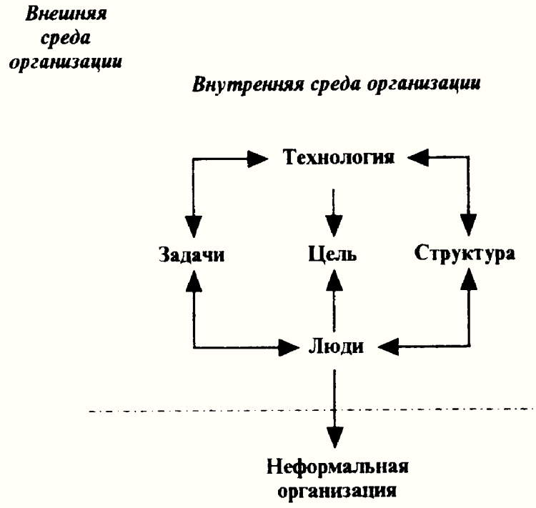Организации и их функции могут быть классифицированы на основе различных принципов по: виду и характеру хозяйственной деятельности; правовому положению; характеру собственности; сферам деятельности; принадлежности капитала; численности работающего персонала; стилю управления и т. д. Вместе с тем, следует отметить, что, несмотря на внешние различия, в деятельности организаций просматриваются общие черты, сходные формы, методы и технологии работы. Большая часть организаций представляет собой открытую систему, целостную, состоящую из многочисленных взаимосвязанных частей, тесно переплетающихся с внешним миром. Организации имеют внутреннюю среду и внешнюю среду. Внутренняя среда организации характеризуется внутренними переменными, которые в основном являются результатом управленческих решений. Это - цели, структура, задачи, технологии и люди (рис. 2.1) *1. ----- *1 Мескон М.Х., Альберт М., Хедоури Ф. Основы менеджмента. - М.: Дело, 1992, С. 89