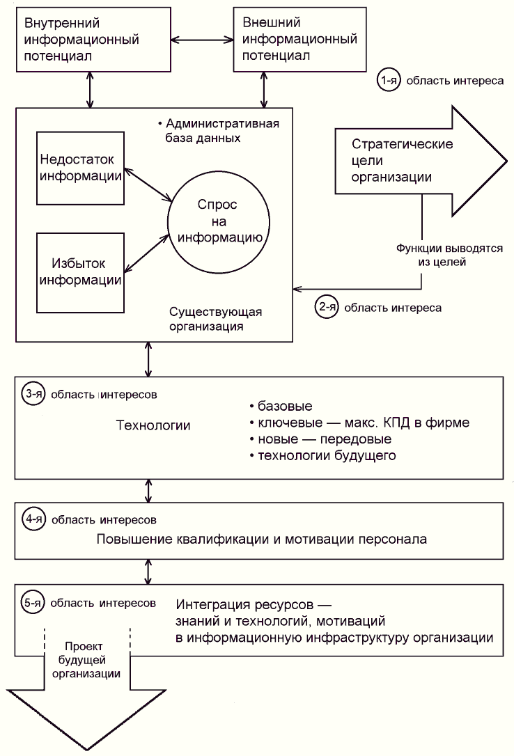 ---- *1 Nefiodow L.A. Der funfte Kondratieff. - Wiesbaden, 1991, С. 64-67, 77. Мы привели эти данные для того, чтобы показать сложности, возникающие вследствие научно-технического прогресса, для персонала организаций в его попытках оценить и отобрать необходимую для управления информацию. Учитывая разнообразие организаций, правильно будет сказать, что информационная модель управления должна разрабатываться для конкретной организации; и по-видимому, она будет представлять собой “уникальный индивидуальный, динамический портрет”, отражающий ее внутреннюю и внешнюю среду в процессе функционирования для достижения стратегических целей организации.