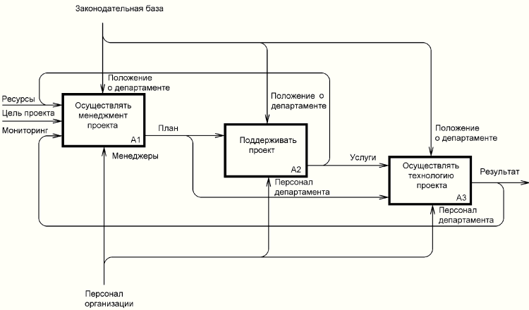 Поэтому проиллюстрируем метод интегрированного графического моделирования документационного менеджмента на примере организации проектного типа. Под проектом будем понимать комплекс мероприятий по получению определенного результата (продукции) с требуемыми рынком характеристиками в пределах установленных сроков и выделенных ресурсов при условии максимизации прибыли. Проектной продукцией может выступать информационная система, транспортное средство, компьютерный программный продукт, архитектурно-промышленное сооружение и т. п. Реализацию конкретной проектной технологии получения определенного результата (продукции или услуг) отнесем к технологической функции проекта. Формирование же целенаправленного осуществления технологической функции проекта и, следовательно, целенаправленного развития всего проекта отнесем к функции менеджмента проекта. Из-за существенной роли целеполагания в системе взаимодействующих функций “менеджмент проекта - проектная технология”, менеджмент называют также целевым менеджментом.