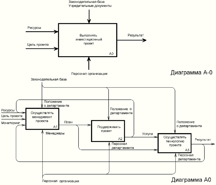 Стандартный этап построения графической модели очередного уровня иерархии системы заключается в декомпозиции отдельно взятого блока с предыдущей диаграммы на его полиблочную структуру в рамках последующей диаграммы. Корректность графического моделирования проекта как иерархической системы обеспечивается соблюдением принципа: блок и его диаграмма представляют одну и ту же часть системы. Это выражается тем, что дуги, входящие в блок и выходящие из него на диаграмме верхнего уровня являются теми же самыми, что и дуги, входящие в диаграмму нижнего уровня и выходящие из него.