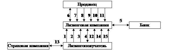 Рис. 3. Схема документооборота при лизинговой операции. Перечень документов: 1. Заявка лизингополучателя по установленной форме. 2. Анкета лизингополучателя по установленной форме. 3. Комплект документов лизингополучателя: P копии учредительных документов, нотариально заверенные, свидетельство о постановке на налоговый учёт из ГНИ, протоколы о назначении генерального директора и главного бухгалтера; P копии форм №1,2 бухгалтерской отчётности предприятия за последние 2-3 отчётных периода, формы №4,5 годового отчёта за последний финансовый год с отметками ГНИ; P расшифровка структуры дебиторской и кредиторской задолженности, краткосрочных и долгосрочных финансовых вложений; P справка о стоимости имущества и сумме обязательств, учитываемых на забалансовых счетах организации; справка о выданных поручительствах с приложением копий договоров по состоянию на дату запроса; P справки по оборотам из обслуживающих банков за последние 3 месяца; P справки, подтверждающие наличие кредитов (с приложением копий кредитных договоров) по состоянию на текущую дату; P копия банковской карточки с образцами подписей, заверенная печатью банка; P перечень имущества (включая денежные средства и прочие активы) за подписью руководителя и главного бухгалтера, с печатью предприятия; P свидетельство на право собственности или договор аренды, подтверждающие право пользования производственными помещениями, где предполагается разместить предмет лизинга (при лизинге автотранспортного средства – документ, подтверждающий место стоянки); P наиболее крупные договоры о реализации работ или услуг в случае наличия; P дополнительные документы, которые могут иметь отношение к проекту. 4. Договор лизинга. 5. Кредитный договор. 6. Договор купли-продажи. 7. Счёт на оплату предмета лизинга. 8. Счёт-фактура. 9. Товарно-транспортная накладная. 10. Справка-счёт на техническое средство. 11. Паспорт технического средства. 12. Свидетельство о регистрации технического средства. 13. Договор страхования (страховой полис). 14. Копия договора страхования (страхового полиса). 15. Копия платёжного поручения об уплате страхового взноса. Договор как правовая форма лизинговой сделки. Основным финансово-правовым документом, определяющим порядок и условия осуществления лизинговой сделки, является договор лизинга. Как правило, он включает следующие разделы: 1) стороны договора: лизингодатель и лизингополучатель; 2) предмет договора (объект лизинга, его наименование, количественные и качественные характеристики); 3) срок действия договора лизинга; 4) права и обязанности сторон; 5) условия лизинговых платежей; 6) страхование объекта лизинга; 7) порядок расторжения договора. Договор лизинга не зависимо от срока заключается в письменной форме. Кроме того, субъекты лизинга заключают ещё обязательные и сопутствующие договоры. К обязательным относится договор купли-продажи. К сопутствующим – договоры о привлечении средств, залога, гарантии, поручительства, страхования и др. В договоре лизинга могут оговариваться обстоятельства, которые стороны считают бесспорным и очевидным нарушением обязательств, ведущие к прекращению действия договора лизинга и изъятию предмета лизинга. Договор лизинга может предусматривать право лизингополучателя продлить срок лизинга с сохранением или изменением условий до