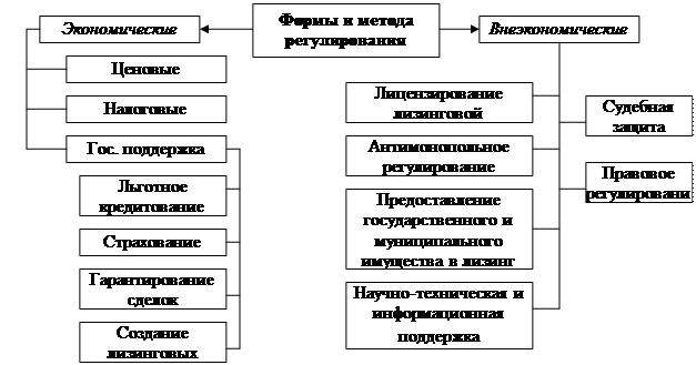 Рис. 6. Формы государственного регулирования лизинговой деятельности в России. Заключение. Тенденции и перспективы развития лизинга в России. Касаясь современного российского рынка лизинговых услуг, можно отметить достаточно динамичное его развитие в последние годы. По данным Банка России объём лизинговых сделок за 2003 год увеличился на 76%. Такая же динамика развития лизинга сохранилась и в последующие три года. Таким образом, лизинг в России является наиболее динамично развивающимся инвестиционным инструментом. Положительно отразились на дальнейшем развитии лизинга принятие новой редакции Закона «О финансовой аренде (лизинге)», изменения в Налоговом кодексе РФ, а также отмена лицензирования лизинговой деятельности в РФ. В соответствии с ФЗ «О лицензировании отдельных видов деятельности» от 8 августа 2001 года №128-ФЗ отменено обязательное лицензирование лизинговой деятельности. Теперь для её осуществления необходима лишь соответствующая запись в учредительных документах. Это в первую очередь привело к росту числа лизинговых компаний и, как следствие, к обострению конкуренции между ними. Появление здоровой конкуренции на рынке лизинговых услуг ведёт к изменению требований к обеспечению лизинговой сделки, постепенному понижению стоимости привлекаемых для финансирования лизинга кредитных ресурсов. Заметно увеличились сроки лизинга: если раньше редкостью были сделки на срок до трёх лет, то сегодня пятилетний лизинг считается вполне нормальным явлением. Однако в России существуют и некоторые проблемы, сдерживающие развитие лизинговой отрасли. К таким можно отнести следующие. Во-первых, финансовая слабость лизинговых компаний, зависимость их от банковского сектора, отсутствие внутренних долгосрочных инвестиционных ресурсов. Во-вторых, пока ещё высокая стоимость кредитных ресурсов, ограниченность вторичного рынка оборудования и, как следствие, жёсткие требования по обеспечению лизинговой сделки. В-третьих, не отработаны механизмы возврата лизингового имущества в случае нарушения лизингополучателем условий договора лизинга. В-четвёртых, недостаточная проработанность нормативно-правовой базы лизинга. Несмотря на это, за последние несколько лет лизинг стал не просто одним из современных финансовых инструментов, а реальной возможностью обновления производственных фондов, внедрения новых технологий. На современном отечественном рынке лизинг воспринимается уже не как налоговая схема, а как реальная возможность получить передовые средства производства. Более того, лизинг становится самостоятельным эффективным бизнесом, являясь реальной альтернативой банковскому кредитованию. Очевидно, что урегулирование правовых вопросов и установление экономически выгодных условий для осуществления лизинговых операций будут способствовать дальнейшему активному развитию лизинга в России. По мнению аналитиков, переход к обслуживанию малого и среднего бизнеса – это ключевая тенденция, которая будет определять развитие российского рынка лизинга в дальнейшем. Интерес к лизингу со стороны среднего и малого бизнеса обусловлен целым рядом факторов. В силу специфики лизинговой схемы, требования к лизингополучателям гораздо ниже, чем, например, при выдаче банковского кредита. Эта особенность весьма актуальна для оте
