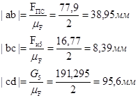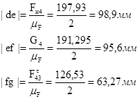 ΣmD = G 4 · μ1 · |h 1 |+ F u 4 · μ1 · |h 2 | – M u 4 – F τ 43 · lCD = 0 F τ 43 = 1/lCD · (G 4 · μ1 · |h 1 | + F u 4 · μ1 · |h 2 | – M u 4 ) = =1/0,65 · (191,295 · 0,01 · 25,6 + 197,93 · 0,01 · 27,4 – 20,96) =126,53 Н Решаем векторное уравнение графически. С этой целью в масштабе μF = 2 Н/мм откладываем все известные векторы, а затем проводим известные направления двух искомых векторов. Длины векторов: