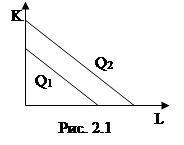 Каждая изокванта характеризует количество определенного объема выпуска. На рисунке приведены 3 изокванты, соответствующие выпуску 100, 200 и 300 единиц продукции, так что можно сказать, что для выпуска 200 единиц продукции необходимо либо К1 единиц капитала и L1 единиц труда, либо К2 единиц капитала и L2 единиц труда, либо какая-то другая их комбинация из множества, представленного изоквантой Q2 = 200. Наклон изоквант характеризует предельную норму технического замещения одного ресурса другим. Изокванты могут иметь различную конфигурацию. Линейная изокванта (рис. 2.1) предполагает совершенную замещаемость производственных ресурсов, так что данный выпуск может быть получен с помощью либо только труда, либо только капитала, либо с использованием различных комбинаций того и другого ресурса при постоянной норме их замещения.