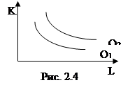 Рис. 2.3 Изокванта на рис. 2.4 предполагает возможность непрерывной, но не совершенной замещаемости ресурсов в определенных границах, за пределами которых замещение одного фактора другим технически невозможно либо неэффективно. Еще одна характеристика производственной функции – интенсивность применения различных ресурсов в определенном производственном процессе. Она определяется наклоном луча, проведенного из начала координат до интересующей точки на изокванте. На рисунке 2.5 производственный способ Р1 более капиталоинтенсивен, чем способ Р2 . Здесь K1 /L1 > K2 /L2 . верхняя часть изокванты включает капиталоинтенсивные, тогда как нижняя – трудоинтенсивные производственные методы.
