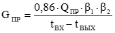 где n, Р - коэффициенты, зависящие от типа, схемы установки прибора, расхода и направления воды. Для проектируемого здания n=0,25 при направлении движении воды снизу-вверх, при расходе теплоносителя 18-61 кг/ч, Р=0,12, n=0,15 при направлении движении воды снизу-вниз; при расходе теплоносителя 18-61 кг/ч, Р=0,08; qНОМ - номинальная плотность теплового потока (теплоотдача 1 м2 прибора при стандартных условиях). Для принятых приборов qНОМ = 633,58 Вт/м2 при движении воды снизу-вверх, qНОМ = 713,78 Вт/м2 при движении воды снизу-вниз; DtСР - средний температурный напор, определяемый по формуле: DtСР = 0,5 (tВХ + tВЫХ ) - tВ, 0 С Расход теплоносителя через прибор GПР определяется исходя из требуемой теплоотдачи прибора QПР по формуле: