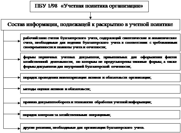 Учетная политика должна отвечать требованиям полноты, осмотрительности, приоритета содержания перед формой, непротиворечивости, рациональности. Она подлежит оформлению организационно-распорядительной документацией (приказы руководителя организации, внутренние правила, инструкции, положения, регламенты, процедуры и др.) [50]. Организация должна раскрывать избранные способы ведения бухгалтерского учета, существенно влияющие на оценку и принятие решений пользователями бухгалтерской отчетности. Кроме того, в бухгалтерской отчетности должны раскрываться способы погашения стоимости основных средств, нематериальных активов и иных активов, оценки производственных запасов, товаров, незавершенного производства и готовой продукции, признания прибыли от продажи продукции и т.п.[83] В ПБУ 1/98 приведен примерный состав информации, подлежащей к раскрытию в учетной политике (рис. 1.2).