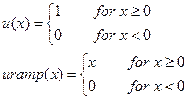Выражения могут содержать следующие операции : +, -, *, /, Ù, а также функции: abs, sin, asin, sinh, asinh, cos, acos, cosh, acosh, tan, atan, atanh, exp, ln, log, sqrt, u, uramp. Функции u (шаг функции) и uramp (интеграл от шага функции) позволяют задавать кусочные функции: