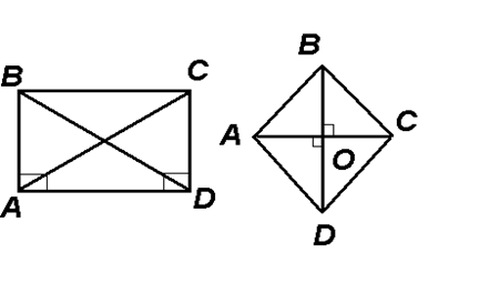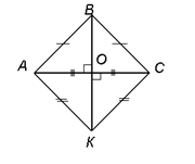 РОЗВЯЗОК: За умовою задачі відрізки АВ і СК мають спільну середину О. Точки А, В, С, К лежать на одній прямій. 1) Проведемо відрізок ОЕ. Якщо О – середина відрізків АВ і СК, то ОЕ є медіаною трикутників АЕВ і СЕК. Якщо трикутник АЕВ – рівнобедрений, тоді ЕО є і висотою. За властивістю медіани рівнобедреного трикутника, ЕО перпендикулярно до СК. 2) Розглянемо трикутники ЕСО та ЕКО. За умовою задачі вони мають спільну сторону ЕО, а СО = ОК. Якщо ЕО перпендикулярно до СК, то кути Ð СОЕ = Ð КОЕ. Отже, за першою ознакою рівності трикутників, за двома сторонами і кутом між ними, трикутники ЕСО і ЕКО рівні. 3) Якщо ЕСО і ЕКО рівні трикутники, то сторони СЕ і КЕ також рівні. Що і треба було довести. № 6. У рівнобедреному трикутнику АВС з основою АС проведено медіану ВМ. На ній узято точку К. Доведіть рівність трикутників: 1) АВК і СВК; 2) АКМ і СКМ. РОЗВЯЗОК: За умовою задачі АВС – рівнобедрений трикутник, ВМ – медіана. В даному трикутнику ВМ є медіаною, висотою та бісектрисою. А отже Ð АВК = Ð СВК, ВМ перпендикулярно до АС, значить Ð АМК = Ð СМК = 90. 1) Розглянемо трикутники АВК і СВК. Вони мають спільну сторону ВК, бічні сторони рівнобедреного трикутника АВ = ВС. А також за властивістю медіани рівнобедреного трикутника Ð АВК = Ð СВК. А це значить, що за другою ознакою рівності трикутників, за двома сторонами і кутом між ними, трикутники АВК і СВК рівні. Що і треба було довести. 2) Розглянемо трикутники АКМ і СКМ. Вони мають спільну сторону КМ, також так як ВМ ділить АС навпіл, то АМ = СМ, а Ð АМК = Ð СМК. Значить, за другою ознакою рівності трикутників, за двома сторонами і кутом між ними, трикутники АКМ і СКМ рівні. Що і треба було довести. № 7. Дано два рівнобедрених трикутника із спільною основою. Доведіть, що їх медіани, проведені до основи, лежать на одній прямій. РОЗВЯЗОК: За умовою задачі АВС і АКС – рівнобедрені трикутники, що мають спільну основу АС. 1) Розглянемо трикутник АВС. Якщо він рівнобедрений, то ВО – медіана і висота, і перпендикулярна до АС. 2) Розглянемо трикутник АКС. Якщо він рівнобедрений, то КО – медіана і висота, яка перпендикулярна до АС. 3) Через точку О до АС проведено два перпендикуляри. За теоремою, через кожну точку прямої можна провести лише одну перпендикулярну до неї пряму. Виходить, що точки В, О і К – лежать на одній прямій, що перпендикулярна до АС. Значить, медіани, проведені до основи, лежать на одній прямій. Що і треба було довести. № 8. Точки А, В, С, К лежать на одній прямій. Доведіть, що коли трикутники АВЕ1 і АВЕ2 рівні, то трикутники СКЕ1 і СКЕ2 також рівні. РОЗВЯЗОК: За умовою задачі точки А, В, С, К лежать на одній прямій. 1) Трикутники АВЕ1 і АВЕ2 рівні. Значить, їх сторони та кути рівні також: ВЕ1 = ВЕ2; Ð АВЕ1 = Ð АВЕ2. 2) Розглянемо трикутники Е1ВС і Е2ВС. Вони мають спільну сторону ВС, Ð Е1ВС = Ð Е2ВС як суміжні з відповідно рівними кутами Ð АВЕ1 = Ð АВЕ2, а також ВЕ1 = ВЕ2. Виходить, що за першою ознакою рівності трикутників, за двома сторонами і кутом між ними, трикутники Е1ВС і Е2ВС рівні. Тому Е1С – Е2С і Ð ВСЕ1 = Ð ВСЕ2. 3) Тепер розглянемо трикутники СКЕ1 і СКЕ2. Вони мають спільну сторону СК, Е1С = Е2С, і Ð Е1СК = Ð Е2СК як суміжні з відповідно рівними кутами Ð ВСЕ1 = Ð ВСЕ2. Виходить, що за першою ознакою рівності трикутників, за двома сторонами і кутом між ними, трикутники рівні: СКЕ1 = СКЕ2. Що і треба було довести. № 9. Побудуйте ромб: 1) за стороною і діагоналлю; 2) за двома діагоналями.