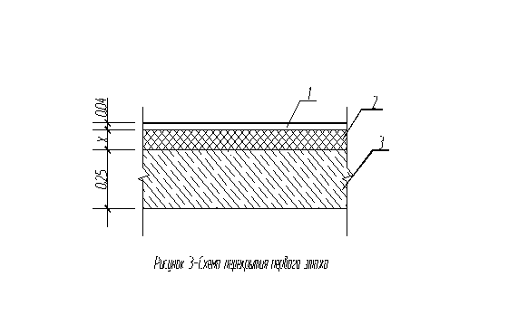 = 1/8,7+0,25/1,92 + X/0,052+ 0,04/0,76 + 1/23= 2,46 [3.6-(0,115+0,13 +0,052+0,043)]×0,052 = X X = (3,6-0,34)×0,052= 0,169 м dут = 17 см Для обеспечения требуемого по градусосуткам сопротивления теплопередаче R0 тр = 3,25 м2 ×0 С/Вт перекрытия по грунту, определяем его конструкцию и рассчитаем толщину утеплителя ( рис.3 ).