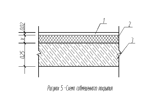= [2,46 – (0,115 +0,028+ 0,026 + 0,043)]×0,22 = x x = 0,5 dбет =0,5м толщина стены 0,5+0,02= 0,54 м Для обеспечения требуемого по градусосуткам сопротивления теплопередаче совмещенного покрытия R0 тр = 3,6 м2 ×0 С/Вт определяем толщину утеплителя в многослойной конструкции покрытия (термическое сопротивление пароизоляции отнесены в запас), схема которого приведена на рисунке 2