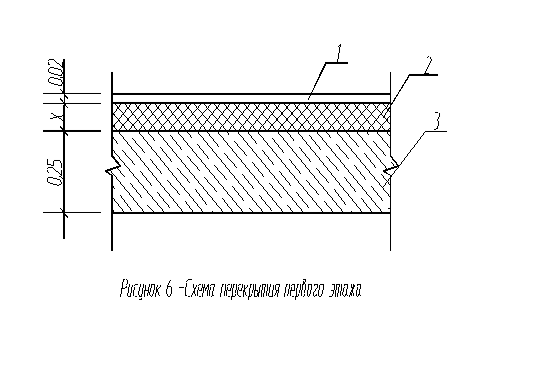 = 1/8,7+0,25/1,92 + X/0,22+ 0,02/0,76 + 1/23= 1,45 [1,45-(0,115+0,13 +0,026+0,043)]×0,22 = X X = (1,45-0,314)×0,22= 0,249 м Принимаем dут = 25 см Перекрытие первого этажа: принимаем следующую конструкцию перекрытия первого этажа, теплотехнические характеристики материалов ( рис. 6) 1. Цементно-песчанный раствор плотностью 1800 кг/м3