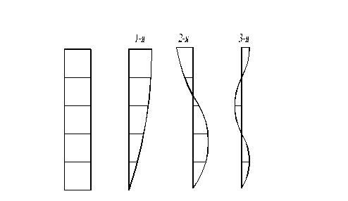 Рисунок 5.5. Формы свободных колебаний * Расчетная сейсмическая нагрузка Sik в выбранном направлении, приложенная к точке k и соответствующая i-му тону собственных колебаний зданий или сооружений (кроме гидротехнических сооружений), определяется по формуле Sik = K1 S0 ik , где К1 - коэффициент, учитывающий допускаемые повреждения зданий и сооружений, принимаемый по табл3; СниП II-7-81* =0.25 S0 ik - значение сейсмической нагрузки для i-го тона собственных колебаний здания или сооружения, определяемое в предположении упругого деформирования конструкций по формуле Soik = Qk Abi Kwnik , где Qk - вес здания или сооружения, отнесенный к точке k, определяемый с учетом расчетных нагрузок на конструкции согласно п. 2.1 СниП II-7-81* =0.9 А - коэффициент, значения которого следует принимать равными 0,1; 0.2; 0,4 соответственно для расчетной сейсмичности 7, 8, 9 баллов; bi - коэффициент динамичности, соответствующий i-му тону собственных колебаний зданий или сооружений, принимаемый согласно п. 2.6 СниП II-7-81*=0.8 Кw - коэффициент, принимаемый по табл. 6 или в соответствии с указаниями разд. 5 СниП II-7-81 =1 Soik =0.9· 0.2·0.8·1=0.144 Сейсмические силы: Σ S5 = 0,25·0.144·1,27·540 = ~ 25 кН Σ S4 = 0,25·0.144·1,21·685 = ~ 30 кН Σ S3 = 0,25·0.144·1,09·685 = ~ 25 кН Σ S2 = 0,25·0.144·0,75·685 = ~ 19 кН Σ S1 = 0,25·0.144·0,382·685 = ~ 10 кН Эти нагрузки распределяются пропорционально жесткостям диафрагм: - для Д-1 коэффициент распределения К1