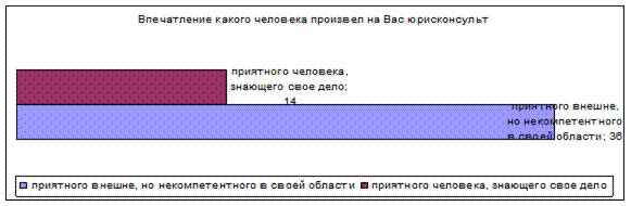 Рис. 10. Первое впечатление работников ОАО «Сибирьтелеком» о юрисконсульте во время проведения собеседования 4. Во время проведения собеседования юрисконсульт не практиковал никаких тестов в отношении претендентов на более полное раскрытие личности, при этом на каждого претендента он затрачивал всего около 20 минут. 5. Всех работающих устраивают условия труда, единственным недостатком они считают отсутствие столовой, что приводит к тому, что голод порой заставляет людей нервничать и злиться по мелочам. 6. Коллектив в ОАО «Сибирьтелеком» слаженный, дружный, отношения между большинством сотрудников хорошие, каждый готов придти на помощь друг другу как в профессиональной сфере, так и в личной жизни; между некоторыми сотрудниками существуют только деловые отношения; ну и меньшинство вообще практически ни с кем не общается (рис.11).