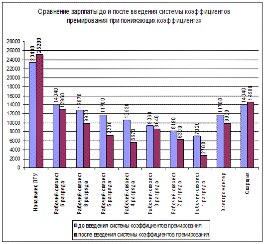 Сравнение заработной платы до и после введения системы коэффициентов премирования при понижающих коэффициентах графически представлено на рис. 15.