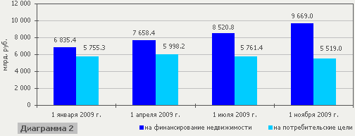 Динамика кредитной задолженности населения в 2009 году Рост кредитной задолженности в отчетном периоде происходил, в основном, за счет кредитования населения на финансирование недвижимости. Так, кредитная задолженность физических лиц на финансирование недвижимости за январь – октябрь 2009 г. увеличилась на 2 833.7 млрд. рублей или на 41.5 процента и на 1 ноября 2009 г. составила 9 669.0 млрд. рублей, из которых 74.2 процента составляет задолженность по льготным кредитам на строительство и приобретение жилья. [8] Прошедший год в каком-то смысле оказался рекордным по числу кредитов, выданных по ставкам 3-5% годовых. Как недавно отметил глава Нацбанка Петр Прокопович, рассказывая об итогах 2009 финансового года, общая задолженность населения по всем жилищным кредитам на 1 января 2010 г. составила Br 10,26 трлн против 6,7 трлн годом ранее. В Нацбанке уверяют, что именно кредитные учреждения сегодня считаются локомотивом финансирования жилищного строительства. Так, в 2009 году за средства консолидированного бюджета было приобретено 280,6 тыс. кв. м жилья, за счет собственных средств организаций, строящих жилье для своих сотрудников, - 264,9 тыс. кв. м. А вот за кредитные ресурсы банков было куплено 2565,4 тыс. кв. м. В Нацбанке отмечают: в 2009 году планировалось построить для граждан, состоящих на учете нуждающихся в улучшении жилищных условий, в многоквартирных жилых домах в городах 2393 тыс. кв. м, или не менее 78% от общего объема. В итоге показатель составил 2 641,8 тыс. кв. м, или 110,4% годового задания. Единственное но: задание так и не было выполнено повсеместно. Проштрафились Минск и Гродненская область. В течение 2009 года Нацбанк осуществлял постоянный контроль за наличием у банков ресурсов для предоставления льготных кредитов в запланированном на текущий год объеме. "Банки перечисляли кредитные средства на оплату стоимости строительства по мере представления расчетных документов на оплату строительно-монтажных работ и выдачу авансовых платежей", - уверяют в ведомстве. Между тем перебои в предоставлении льготных кредитов, которые время от времени в 2009 году случались, объясняют… хорошей работой банков. В какие-то периоды они выдавали кредиты сверх положенной нормы и тогда приходилось "притормаживать", чтобы войти в правильный график. Специалисты уверены, что, если в стране будет принят указ главы государства о льготном кредитовании 100% стоимости строящегося жилья, интерес к банковским кредитам возрастет многократно. В соответствии с действующим законодательством максимальный объем кредита на жилье, выдаваемый банками, составляет 70-95% от стоимости квартиры. Но отсутствие у покупателей необходимой стартовой доли сдерживает рост кредитования.[3] При этом банки значительно сократили объемы кредитования физических лиц на потребительские цели в связи со снижением платежеспособности населения. Так, за январь – октябрь текущего года объем кредитной задолженности на потребительские цели сократился на 236.3 млрд. рублей или на 4.1 процента. По состоянию на 1 ноября 2009 г. задолженность по потребительским кредитам населения составила 5 519.0 млрд. рублей. Удельный вес кредитов на потребительские цели в общем объеме кредитной задолженности населения на 1 ноября 2009 г. составил 36.3 процента против 45.7 процента на 1 января 2009 г. и 46.7 процента на 1 ноября 2008 г. Ведущим банком в республике по 