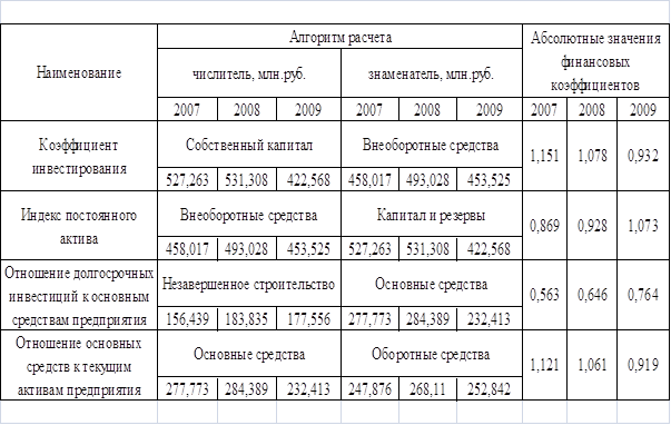Коэффициент инвестирования показывает способность капитала за счет собственного капитала финансировать внеоборотные активы. За анализируемый период наблюдается понижательная тенденция. При нормативе Ки = 1 в 2007 г. он составил 1,151, в 2008 – 1,078. В 2009 г. данный показатель оказался ниже норматива и составил 0,932. Индекс постоянного актива показывает, какая часть внеоборотных активов предприятие способно финансировать за счет собственного капитала. За анализируемый период произошло увеличение данного коэффициента на 20,4%. Данное увеличение вызвано в основном значительным (на 20%) уменьшением собственного капитала предприятия. В 2009 г. ОАО «Богословское рудоуправление» за счет собственного капитала способно полностью профинансировать внеоборотные активы. Проанализировав отношение долгосрочных инвестиций к основным средствам предприятия можно сделать вывод о следующем. За анализируемый период наблюдается повышательная тенденция данного показателя. Также за анализируемый период наблюдается увеличение величины основных средств по сравнению с оборотными средствами предприятия. В таблице 10 проведен анализ оценки рыночной устойчивости. Коэффициент финансовой зависимости предприятия («финансовый рычаг предприятия») показывает количество финансовых ресурсов, которое предприятие привлекает на 1 рубль собственного капитала. Для 2009 г. финансовый рычаг составил 1,672. За анализируемый период наблюдается повышательная тенденция. Коэффициент финансовой напряженности показывает количество привлеченных финансовых источников, которые приходятся на единицу собственного капитала. В 2009 г. составил 0,672 при нормативе Кфн ≤ 1, т.е. на 1 рубль собственного капитала ОАО «Богословское рудоуправление» дополнительно использует 67 копеек привлеченных финансовых источников. За анализируемый период наблюдается повышательная тенденция. Коэффициент финансовой нагрузки на рубль собственного капитала (плечо финансового рычага) показывает сколько банковских займов и кредитов предприятие привлекает на 1 рубль собственного капитала. В 2009 г. данный коэффициент составил 0,047, т.е. на 1 рубль собственного капитала ОАО «Богословское рудоуправление» привлекает 4,7% банковских заимствований. За анализируемый период наблюдается нестабильная тенденция – сначала рост коэффициента в 2008 г. по сравнению с предыдущим, затем снижение в 2009 г. по сравнению с 2008 г. В целом за анализируемый период коэффициент финансовой нагрузки снизился с 0,062 в 2007 г. до 0,047 в 2009 г. В 2009 г. у предприятия не было краткосрочных банковских заимствований. Поэтому коэффициент соотношения «длинных» и «коротких» банковских заимствований был не был рассчитан. Тем не менее годом ранее в 2008 г. он составлял 0,645, т.е. на каждый рубль краткосрочных займов и кредитов приходится 64,5 коп. «длинных» кредитов.