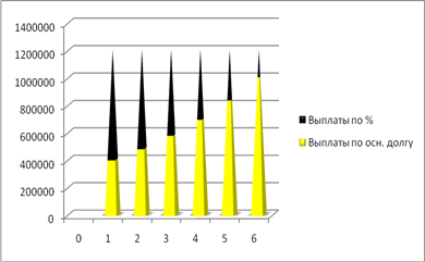 Согласно данным табл. 3 на начальных периодах в структуре выплат преобладают выплаты по процентам, тогда как в последующих периодах доминируют выплаты по основному долгу. Данный факт наглядно проиллюстрирован на приведенном ниже рисунке: