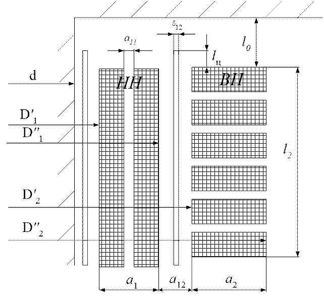 Рис. 7. Схема обмоток НН и ВН и изоляционных расстояний трансформатора Масса меди обмотки ВН