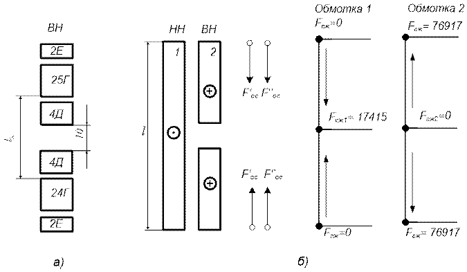Рис. 8. Механические силы в обмотках трансформатора а) схема расположения катушек обмотки ВН по рис.6. б) схема осевых сил обмоток НН и ВН Наибольшая сжимающая сила наблюдается в середине обмотки НН (обмотка 1), где F сж1 = 174715 Н. Напряжение сжатия на междувитковых прокладках