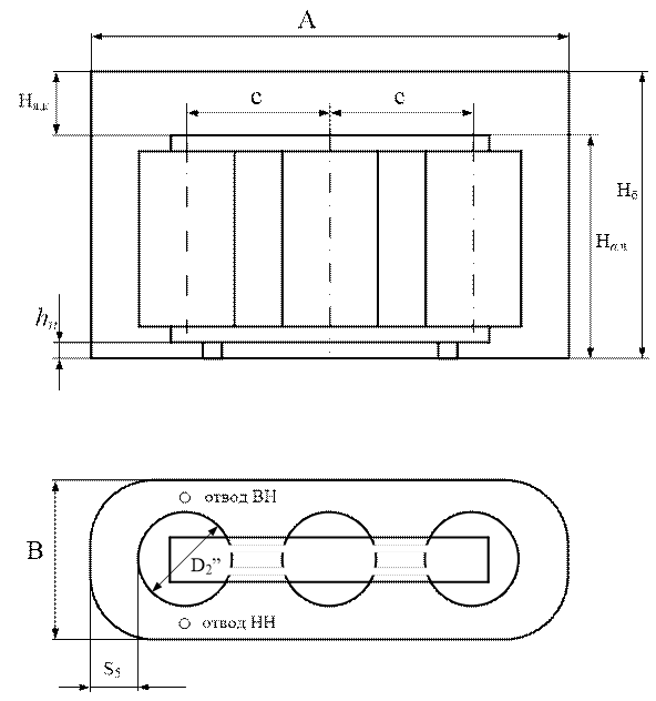 Рис. 12. Схема бака трансформатора Изоляционные расстояния по табл. П.29 (рис.13): ― расстояние от изолированного отвода обмотки ВН до стенки бака ― изоляционное расстояние от изолированного отвода обмотки ВН до собственной обмотки ― изоляционное расстояние от отвода обмотки НН до обмотки ВН ― изоляционное расстояние от отвода обмотки НН до стенки бака диаметр изолированного отвода от обмотки ВН, диаметр изолированного отвода обмотки НН