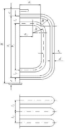 где По табл. П.30 для мощности 1600 кВА выбираем бак с двумя рядами овальных труб (рис. 14). Размеры трубы: ― сечение, мм – 72×20; ― радиус закругления R= 188 мм; ― шаг труб между рядами tP = 100 мм; ― прямой участок для внутреннего ряда труб принимаем а1 = 50 мм; а2 = а1 + tр = 50+100 = 150 мм; По табл. П.31 по размеру наружного ряда труб выбираем минимальные значения с и е. с min = 75мм, е min = 85мм. Расстояние между осями труб на стенке бака (по рис.14): Наружный ряд Внутренний ряд Развернутая длина трубы (рис.14) первый (внутренний) ряд