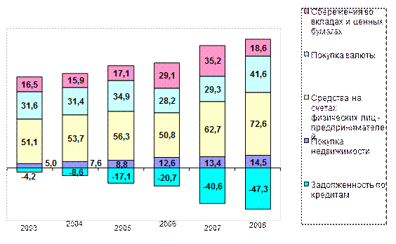 Из таблицы 15 видно, что в структуре потребительских расходов до 2005 года наблюдалась тенденция снижения доли расходов на покупку товаров, по сравнению с предыдущим годом (2003г. - 63,6%, 2004г. - 63,3%, 2005г. – 62,6%), однако с 2006 года эта доля стала увеличиваться (2006г. – 63,0%, 2007г. - 64,2%, 2008г. - 65,0%). На сбережение населением Хабаровского края в 2008 году было использовано 39,7 млрд. рублей. К сбережениям, согласно методологии баланса денежных доходов и расходов населения относятся: прирост (уменьшение) вкладов на счетах граждан, расходы на приобретение ценных бумаг, недвижимости, иностранной валюты, изменения средств на счетах физических лиц – предпринимателей, задолженность по кредитам. На рисунке 1 показана структура сбережений населения (в процентах к итогу).