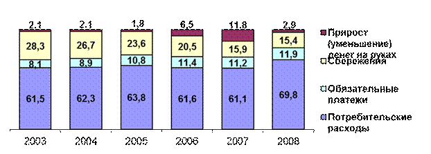 Рисунок 1– Структура сбережений населения На все виды сбережения населением Хабаровского края в 2008 году было использовано 39,7 млрд. рублей. В структуре расходов населения за последние годы произошли определенные изменения. Так, расходы на потребительские цели в 2008 году, по сравнению с 2003 годом, увеличились на 8,3 п.п., расходы на оплату обязательных платежей и добровольных взносов на 3,8 п.п. Отмечается снижение доли сбережений на 12,9 п.п. На рисунке 9 продемонстрировано использование денежных доходов населения (в процентах от общего объема денежных доходов).