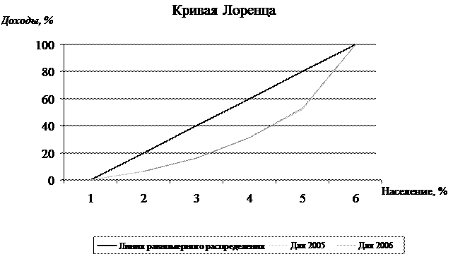Рисунок № 3. Кривая Лоренца. Заключение Социальная статистика занимается всесторонним и глубоким изучением состояния и развития экономики страны, различных социальных процессов, происходящих в ней, их закономерностей, путем сбора, обработки, анализа и обобщения данных о них. На современном этапе рыночных отношений можно выделить такие основные задачи: на базе современной системы статистических показателей, методологии их расчета и методов сбора статистической отчетности завершить создание модели государственной статистики, адаптированной к условиям развития рыночных отношений; усилить интегрирующие функции органов государственной статистики в общем процессе информационного отображения общественных явлений в стране; сформировать единую методологическую основу для отраслевых систем статистической информации; обеспечить высокую оперативность и максимальную достоверность статистических данных; повысить программно-технологический и технический уровень системы. Показатели, изучаемые в данной отрасли, используются в изучении мероприятий по социальной защите населения России, в том числе, индексации доходов населения. При этом устанавливается порог повышения индекса цен по фиксированному набору товаров и услуг, который и служит своеобразным сигналом корректировки доходов. Список использованной литературы 1. Гусаров В.М. Теория статистики: М.: «Аудит», издательское объединение «ЮНИТИ», 2008. 2. Курс социально - экономической статистики. Учебник / под редакцией М.Г. Назарова: М.: ЗАО «Финстатинформ», «Юнити», 2005. 3. Лапунина Л., Четверина Т. Напряженность на Российском рынке и механизмы ее преодоления: Вопросы экономики, № 2, 2008. 4. Общая теория статистики: статистическая методология в изучении коммерческой деятельности, Учебник / под редакцией А.А. Спирина, О.Э. Башиной: М.: «Финансы и статистика», 2006. 5. Практикум по статистике: Учебное пособие для вузов/ под редакцией В.М. Симчеры/ ВЗФЭИ.-М.: ЗАО «Финстатинформ», 2009. 6. Российский статистический ежегодник 2007. Госкомстат. 7. Российский статистический ежегодник 2008. Госкомстат. 8. Российский статистический ежегодник 2009. Госкомстат. 9. Сабирьянова К. Микроэкономический анализ динамических изменений на Российском рынке труда. Вопросы экономики, № 1, 2008. 10. Социальная статистика / Под ред. чл.-кор. РАН И.И. Елисеевой. - М.: Финансы и статистика, 2007. 11. Статистика / Под ред. В.С. Мхитаряна, - Академия, 2007. Приложение Корреляционно-регрессионный анализ Корреляционно-регрессионный метод исследования состоит их двух этапов. К первому этапу относится корреляционный анализ, а к второму регрессионный. Корреляционный анализ имеет своей задачей количественное определение тесноты связей между двумя признаками при парной связи между результативным и множеством факторных признаков при многофакторной связи. Регрессионный анализ заключается в определении аналитического выражения связи, в которой изменение одной величины (результативного признака) обусловлена влиянием одной или нескольких независимых величин (факторов). Такая зависимость выражается уравнением прямой: y= a0 +a1 x, где y –индивидуальное значение результативного признака, X - индивидуальное значение факторного признака, a0 и a1 –параметры равнения регрессии.