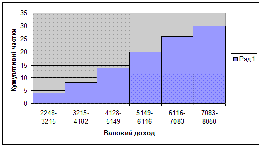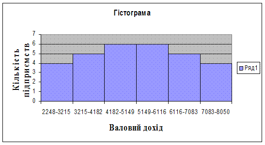 Значення h також округляємо до цілого у велику сторону. h= Після цього можемо встановити межі групувальних інтервалів: · нижня межа першого групувального інтервалу a1 =Ymin ; a1 =994; · верхня межа першого групувального інтервалу b1 =a1 +h; b=969+1279=2273; Межі наступних інтервалів встановлюємо так: нижня межа чергового інтервалу приймається рівній верхній межі попереднього інтервалу, а верхня межа дорівнює нижній плюс ширина групувального інтервалу. В результаті весь діапазон зміни значень змінної розбивається на 7 рівних по величині інтервалів. Одночасно зі встановленням меж групувальних інтервалів задаємо умови віднесення спостережень на інтервал. Їх задаємо у вигляді подвійної нерівності: ak £ Y < bk , k=1,2,3, ..., K. Відповідно до цієї умови на інтервал з номером k відносимо ті значення досліджуваної ознаки, які більше або рівні нижньої границі і менше верхньої границі. Далі розподілимо одиниці вибіркової сукупності (підприємства) по інтервалах у залежності від величини результативної ознаки. Таблиця 2.4 – Групування підприємств по величині валового доходу, тис. грн.