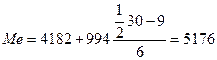 Рис. 2.3 Графічне визначення медіани Графічно медіана визначаємо по кумуляті. Останню ординату кумуляти, рівну сумі всіх частот або часток, ділимо навпіл. З отриманої точки проводимо перпендикуляр до кумуляти. Абсциса точки перетинання і дає значення медіани. Співвідношенням моди, медіани і середньої арифметичної користаються для розпізнавання симетричності варіації. Необхідною, але недостатньою умовою симетричності є рівність трьох характеристик: Як показники формоутворення застосовуються: - коефіцієнт асиметрії Пирсона