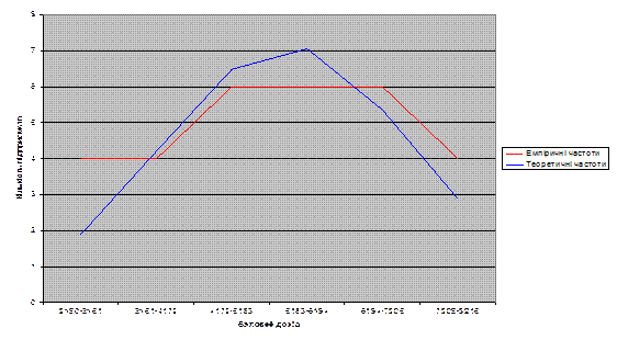 Рис.2.4 Графік теоретичних і емпіричних частот Сума теоретичних і емпіричних частот повинна бути рівною, але може не збігатися через округлення в розрахунках. Для перевірки гіпотези про близькість емпіричного і теоретичного розподілів розрахуємо критерій згоди Пирсона