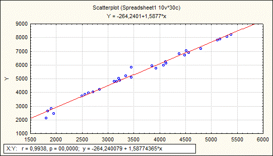 , що має найвищу кореляцію з результативним показником Y (тобто пару перемінних 1) Форма зв'язку лінійна між Y і досліджуваною факторною змінною Х1 . 2) Отже рівняння регресії виду 3) Це рівняння є статистично значущим. 3.2.1 Вибір рівняння регресії між двома ознаками Для вибору форми зв'язку застосуємо раніше побудований графік із зображенням кореляційного поля (графік залежності перемінних Yi і обраної X1 ). По його вигляду визначаємо, що між даними змінними лінійна форма зв’язку.