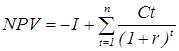 2.3 Источники финансирования инвестиционных проектов 2.3.1 Исходные данные для анализа инвестиционных проектовИсходными данными для анализа инвестиционных проектов являются: · Количество охраняемых объектов – 900 шт · Плата за охрану объектов – 1080 руб./мес. Инвестиционный проект должен обеспечить возможность охраны минимум 900 объектов без увеличения затрат (стоимости). Согласно нормативным документам организации службы вневедомственной охраны стоимость охраны одного объекта определена с учетом всех затрат на содержание, техническое обеспечение, оплаты услуг сторонним организации из расчета определенного количества объектов, подключенных к данной СЦН. Необходимо рассмотреть как собственные источники финансирования проектов, так и заемные. Собственными источниками могут служить прибыль от реализации услуг, целевые поступления, собственные средства за счет реинвестирования части прибыли и амортизационных отчислений. Заемные средства можно получить в Челябинвестбанке из расчета условий кредитования 25% годовых. 2.3.2 Методы оценки инвестиционных проектовСрок работы проекта примем равным 5 лет, как оптимальный срок эксплуатации электронного оборудования. Для каждого проекта рассчитаем чистый приведенный эффект (NPV) (формула 4.1). Поскольку приток денежных средств распределен во времени, он дисконтируется с помощью коэффициента r, равного рентабельности активов предприятия, который на 1 января 2001 года составляет 6, 5%, и для сравнения денежные потоки дисконтируем с коэффициентом, равным ставки кредитования, с целью выявления возможности получения банковского кредита. Для анализа эффективности планируемых инвестиций рассчитаем норму рентабельности инвестиции (IRR) (формула 4.2). IRR показывает максимально допустимый уровень расходов, связанный с данным проектом.